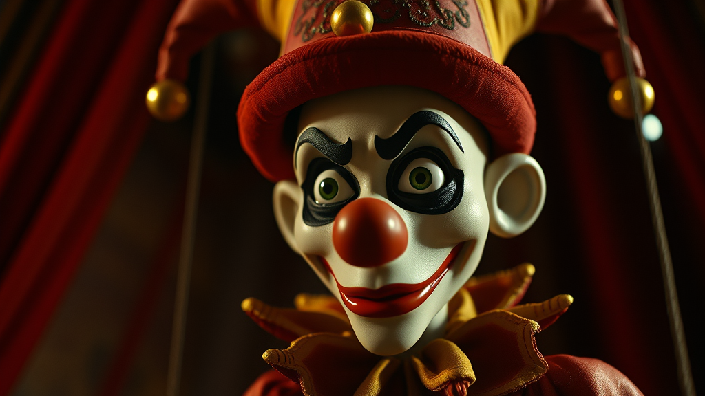 Cinematic portrait of a puppet jester with mischievous eyes, filmed in the whimsical style of Tim Burton. The puppet wears an ornate Fool's outfit and a jingling cap 'n' bells hat, displayed theatrically on a puppet stage. Shot with a 1970s Leica M3 rangefinder, Summicron 35mm lens, capturing the mood at a wide aperture of f2, ISO 600, and shutter speed 1/50, on vintage Kodak color film. The close-up eye-level shot utilizes dramatic, cinematic lighting to highlight the puppet's features, maintaining a timeless visual appeal. The scene exudes a haunting charm, blending theatricality and Burton-esque fantasy, without any signs of poor quality or technical flaws.