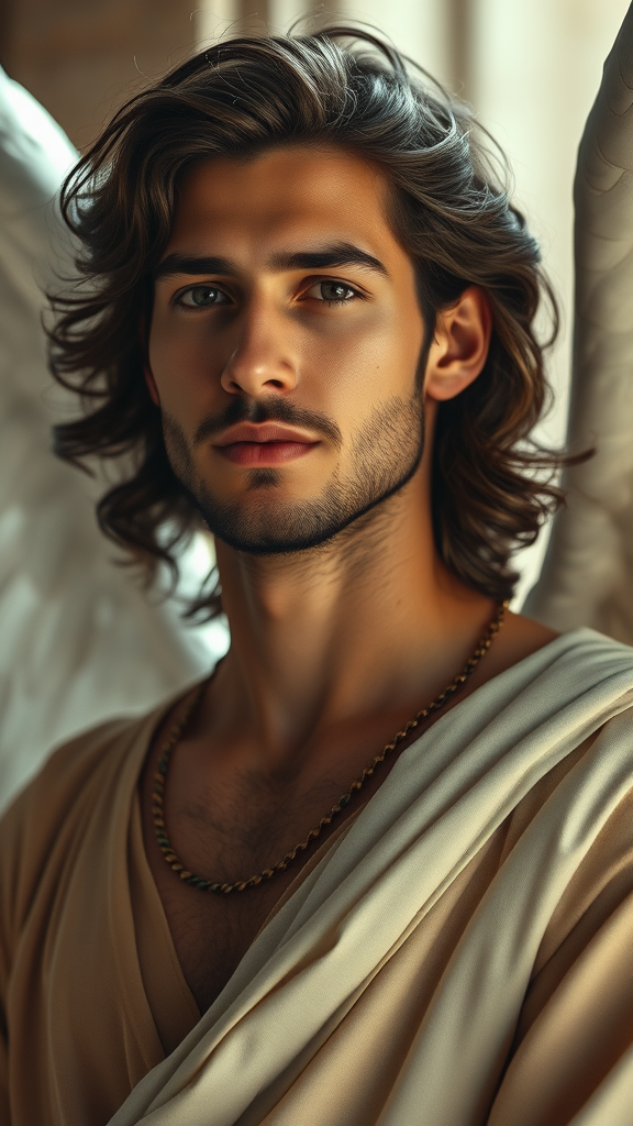 Cinematic portrait of Angel Gabriel, showcasing his divine form with exquisite details of his flawless skin and intricate textures. He is elegantly dressed in traditional Archangel attire, the setting serene and deeply spiritual. An ethereal glow envelops his figure, elevated by soft, heavenly lighting. Captured photographically in an extraordinary display of photorealism with a Sony Alpha 1 camera using an 85mm lens at f/1.4 aperture, a shutter speed of 1/500, and ISO 100. The final image is rendered in 8K UHD, highlighted by a subtle palette of muted and neutral tones, embodying both elegance and tranquility.