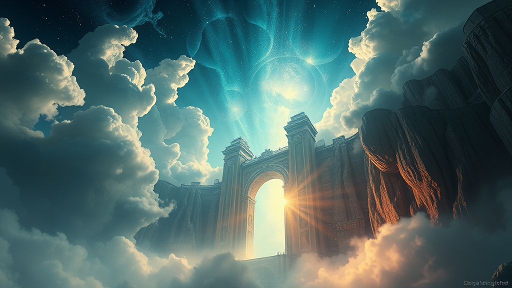 Cinematic portrayal of ethereal gates to heaven, intricately detailed, 8k resolution, hyper-realistic and atmospheric, inspired by the styles of Ivan Aivazovsky, Peter Mohrbacher, and Greg Rutkowski. Features volumetric light effects and broad illumination, reminiscent of oil paintings with a blend of fantasy and sci-fi elements. Emphasizes realism akin to premium prints, with the vividness of an Unreal Engine rendering, capturing an awe-inspiring celestial scene.