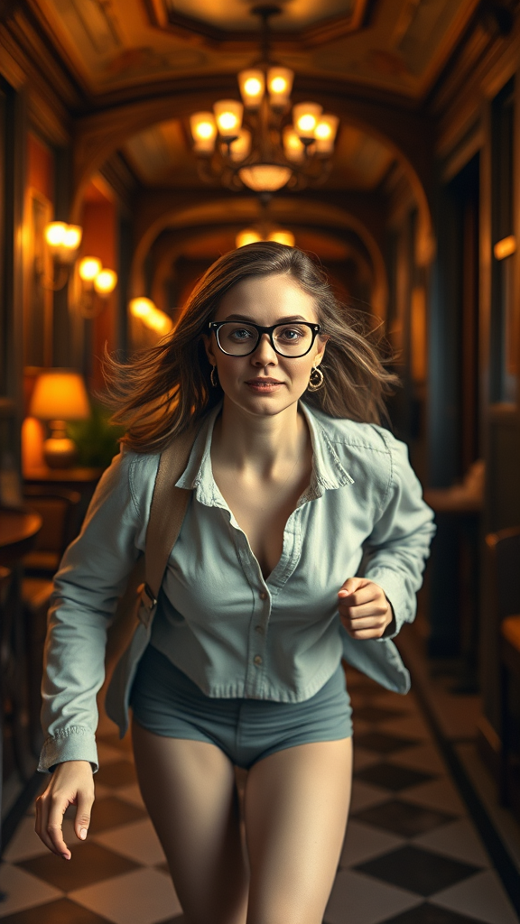 A beautifully cinematic scene capturing a woman with glasses sprinting as her eyes lock with the camera, exuding an aura of warmth and intrigue. Her surroundings echo the nostalgic charm of a Wes Anderson film, filled with intricate details reminiscent of The Grand Budapest Hotel. The setting is cozy, bathed in a warm palette, enhancing the analog feel of a classic 35mm photograph. Each element contributes to a harmonious composition, balancing the vibrance of her movement with the stillness of her detailed environment.