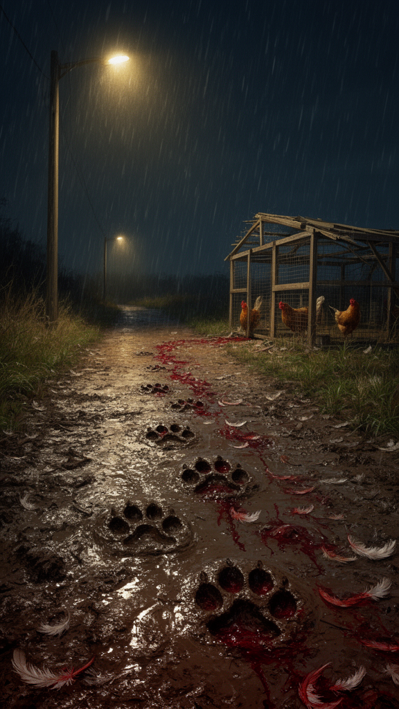 Cinematic semi-realistic artistic illustration of muddy fox paw prints on a wet muddy path. at night, heavy rain falling, flickering streetlight, dark cinematic lighting, emotional atmosphere, painterly textures, horizontal composition. we see a broken-in chicken coop at the end of the road. bloody feathers are on the road leading from the paw prints to the chicken coop.