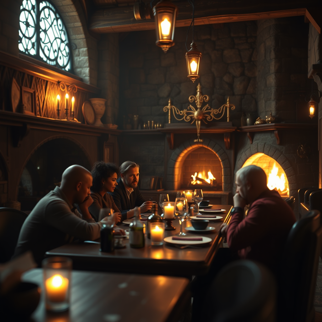 Cinematic shot captured with a 200mm lens, showcasing an award-winning CGI scene with a perfect angle. The setting features a group sitting together, sharing a meal in an intimate and surreal environment. The composition is epic, with intricate details of a medieval bar interior, complete with a warm and inviting fireplace. The focus is sharp and the rendering smooth, employing advanced techniques like raytracing for specular lighting and depth of field, along with volumetric lighting and reflections. Rendered with Octane, the scene is presented in HD, UHD, climbing up to 64K and 128K for a masterpiece-level professional finish. The cozy atmosphere contrasts beautifully against the surreal backdrop, crafting an unforgettable and visually stunning experience.