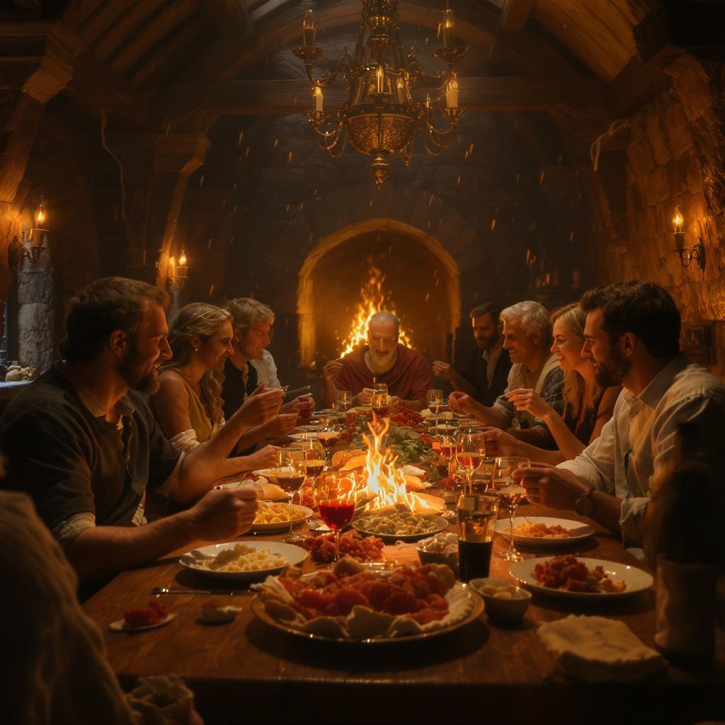 A stunning, cinematic shot captured with a 200mm lens, reminiscent of award-winning CGI scenes. The perfect angle reveals a group sitting together, enjoying a meal reminiscent of a modern "last supper." The setting is cozy yet surreal, with an epic composition framed by a detailed medieval bar interior. A warm fireplace casts a comforting glow, enhancing the scene with hard focus and smooth raytracing. Specular lighting and depth of field work harmoniously with volumetric lighting to create a sense of immersion. Reflections and light reflections are expertly crafted, highlighting the octane-rendered 3D elements in UHD and 64K resolution. This masterpiece is professional work, showcasing artistic brilliance with an emphasis on character interaction and ambient storytelling.