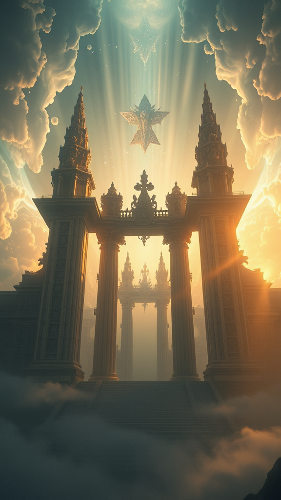 Cinematic shot of the celestial gates to heaven, intricately detailed, 8k resolution, highly realistic and atmospheric, in the style of Ivan Aivazovsky, Peter Mohrbacher, and Greg Rutkowski. Volumetric light effect casts ethereal illumination, broad light cascading over the ethereal structures. An oil painting feel infused with fantasy art elements, blending sci-fi with realism, creating a masterpiece suitable for premium prints. Rendered with stunning clarity using Unreal Engine, evoking a sense of wonder and transcendence.