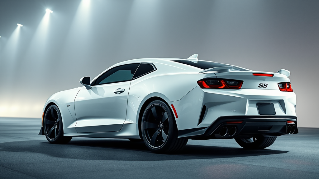 Cinematic showcase of a 2020 white Camaro SS, captured in stunning 32k Ultra-HD super-resolution, featuring sleek angles and dynamic lighting to highlight its aerodynamic design and powerful presence.