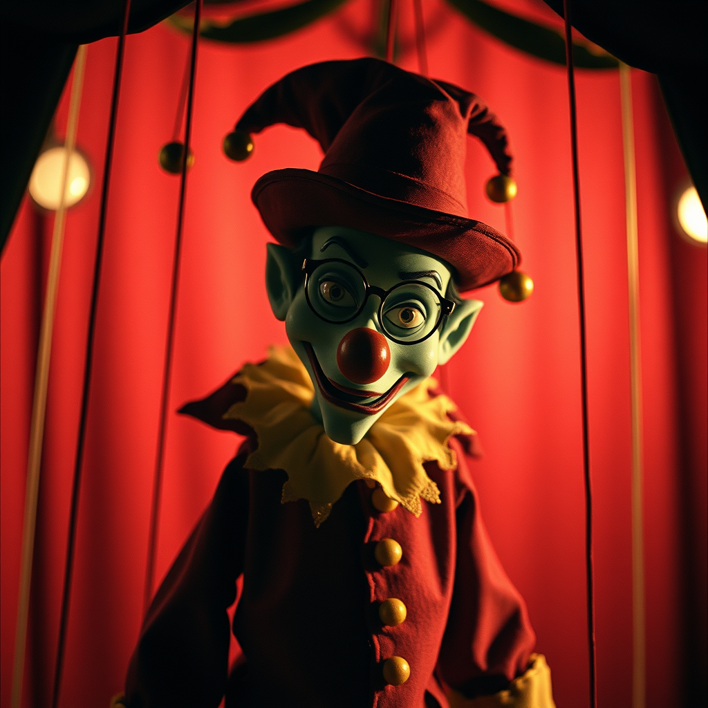 Cinematic still portrait capturing a Tim Burton-inspired scene, featuring a Puppet of Jester with mischievous eyes, wearing a traditional Fool's outfit and a cap 'n' bells hat. The Jester stands on a puppet theater stage, framed in a portrait shot with cinematic and dramatic lighting. Shot using a 1970s Leica M3 rangefinder camera with a Summicron 35mm lens, set at a wide aperture of f2, ISO 600, and a shutter speed of 1/50, utilizing 1970s Kodak color film. The image is an eye-level close-up, showcasing the puppet's intricate design and detailing with a cinematic flair. The setting is devoid of any bad anatomy, text, signatures, watermarks, or visible usernames, ensuring high resolution and quality without jpeg artifacts or poorly framed elements.