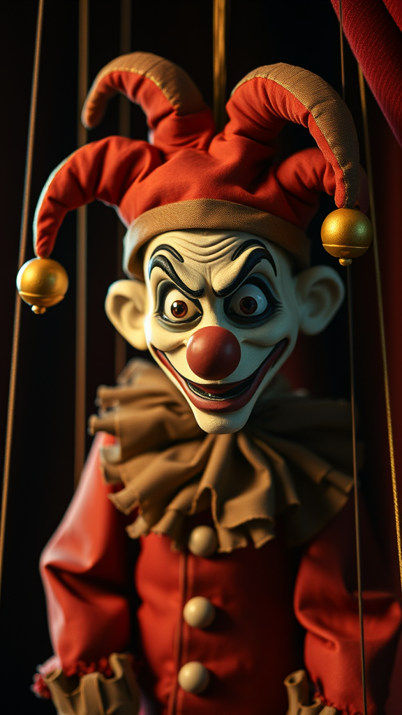 Cinematic still portrait, directed by Tim Burton, Jester puppet with mischievous eyes wearing a classic Fool's outfit and cap 'n' bells hat. Positioned on a vintage puppet theater stage, captured as a portrait shot with cinematic, dramatic lighting. Photographed using a 1970's Leica M3 rangefinder, Summicron 35mm lens, at wide aperture f2, ISO 600, and shutter speed 1/50, on 1970s Kodak color film. Close-up at eye level shot, showcasing intricate puppet style. Excludes bad anatomy, text, signature, watermark, username, low resolution, worst quality, low quality, jpeg artifacts, blurry, cropped, badly framed.