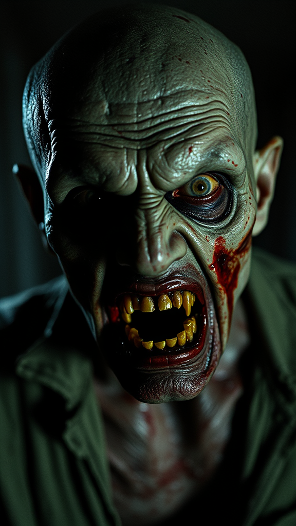 Cinematic still portrait filmed by George A. Romero, hyper-realistic deranged zombie man stares at the camera with hungry eyes. The zombie's skin is a mottled greenish hue, marked with visible stains. His eyes are sunken, glazed, and unfocused, wearing torn and bloodstained clothing. The mood is grotesque and unsettling, evoking a general sense of decay. Captured in a portrait shot with cinematic lighting using a 1970's Leica M3 rangefinder, Summicron 35mm lens, wide aperture of f4, ISO 400, shutter speed 1/125, on 1970s Kodak color film. Horror style, avoiding imperfections such as bad anatomy, text, signature, watermark, username, low resolution, worst quality, low quality, jpeg artifacts, blurry, cropped, or badly framed.