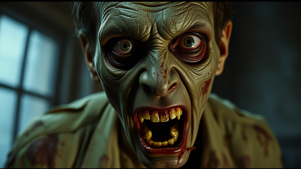 Cinematic still portrait filmed by George A. Romero, hyper-realistic deranged zombie man stares hungrily at the camera. Zombie skin is mottled green with visible stains, eyes sunken, glazed, unfocused. Wears torn, bloodstained clothing. Mood is grotesque and unsettling, conveying decay. Captured in a portrait shot, cinematic lighting, using a 1970s Leica M3 rangefinder, Summicron 35mm lens, wide aperture f4, ISO 400, shutter speed 1/125 on 1970s Kodak color film. Horror style, devoid of any bad anatomy, text, signatures, or artefacts, with high resolution and excellent framing.