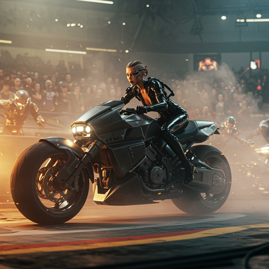 Cinematic ultra-wide RAW photo of cyber-enhanced biker Zzz powering her sleek battle bike through a dynamic race in a smoky arena. She wears a black, skin-tight latex jumpsuit adorned with intricate implants, leaning forward with intensity. The futuristic bike gleams under cinematic lighting, surrounded by a crowd of cyber bikers in pursuit, creating an exhilarating chase scene. Motion blur enhances the sense of speed, while the arena echoes with excitement. Hyper-realism and extreme detail capture the essence of a cyberpunk, hyper-futuristic world. Influenced by the style of the 2000s, the scene is reminiscent of the Wachowskis' vision, with an extreme wide shot, sharp DOF, and meticulous crafting, showcasing high resolution and excellent quality without any imperfections.