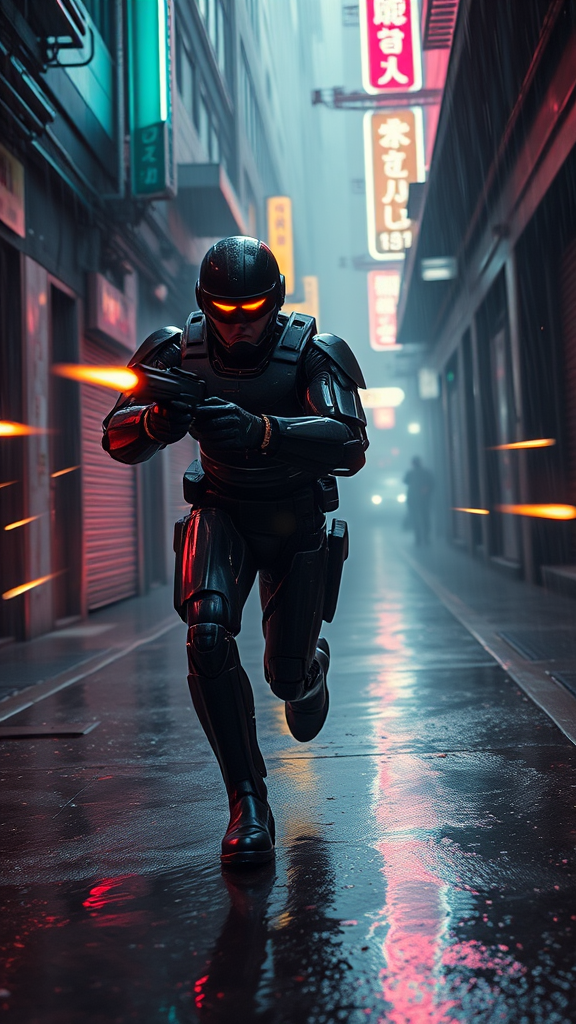 Cinematic ultra-wide shot of a cyborg police officer engaged in a gunfight on a futuristic RoboCop-like scenario, featuring streamlined cybernetic limbs and a sleek helmet with a glowing visor, dashing forward with kinetic energy as bullets whiz past, creating a flurry of motion blur. The scene unfolds in a rain-soaked, grim alleyway illuminated by vibrant neon lights, with tendrils of smoke accentuating the dramatic, cinematic lighting. Capturing the essence of hyper-realism and intricate detail, the composition embodies the themes of trans-humanism and cyberpunk, infused with a hyper-futuristic vision, reminiscent of the 1980s style as if directed by Paul Verhoeven in his prime. The setting is vast, and the framing flawless, ensuring every element is sharply defined and preserved in high resolution.