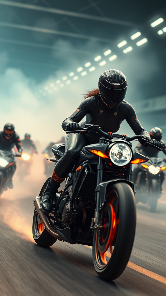 Cinematic ultra-wide still RAW photo of cyber-enhanced biker Zzz on her advanced battle bike, clad in a sleek black skin-tight latex jumpsuit adorned with intricate implants. She leans forward, skillfully maneuvering her aerodynamic and futuristic battle bike amidst a dynamic race in a smoke-filled bike battle arena. A throng of cyber bikers trail her, their figures blurred by speed. The scene is illuminated by dramatic cinematic lighting, shot in extreme wide angle for hyper-realism and hyper-detail. Embracing a cyberpunk, hyper-futuristic aesthetic inspired by the early 2000s, captured in the visionary style akin to the Wachowskis. Features no mockup, flawed anatomy, text, signature, watermark, username, low resolution, poor quality, jpeg artifacts, blurry elements, cropping, or awkward framing. Aspect ratio 7:5, high complexity of 20, shot with a sharp sense of style, version 4.