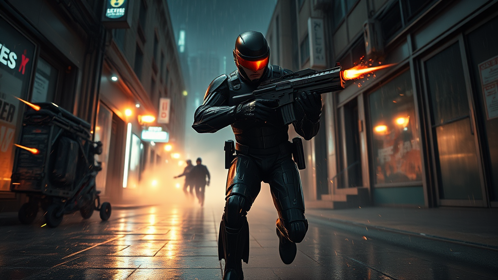 Cinematic ultra-wide still shot of a cyborg law enforcement officer inspired by RoboCop engaging in a fierce gun battle, equipped with advanced cybernetic limbs and sporting a sleek helmet with a glowing visor. He's captured mid-stride in a dynamic pose, surrounding him are whizzing bullets and ricocheting sparks. The scene unfolds at night under a torrential downpour in a desolate urban alleyway, illuminated by flickering neon lights and shrouded in misty smoke. The cinematic lighting accentuates the hyper-realistic and hyper-detailed visuals, encapsulating themes of trans-humanism and cyberpunk. Set in a hyper-futuristic landscape reminiscent of the 1980s aesthetic, as if shot by a visionary director like Paul Verhoeven—showcasing bold kinetic energy, intriguing atmospheric depth, and striking contrasts without any overlays or distractions.