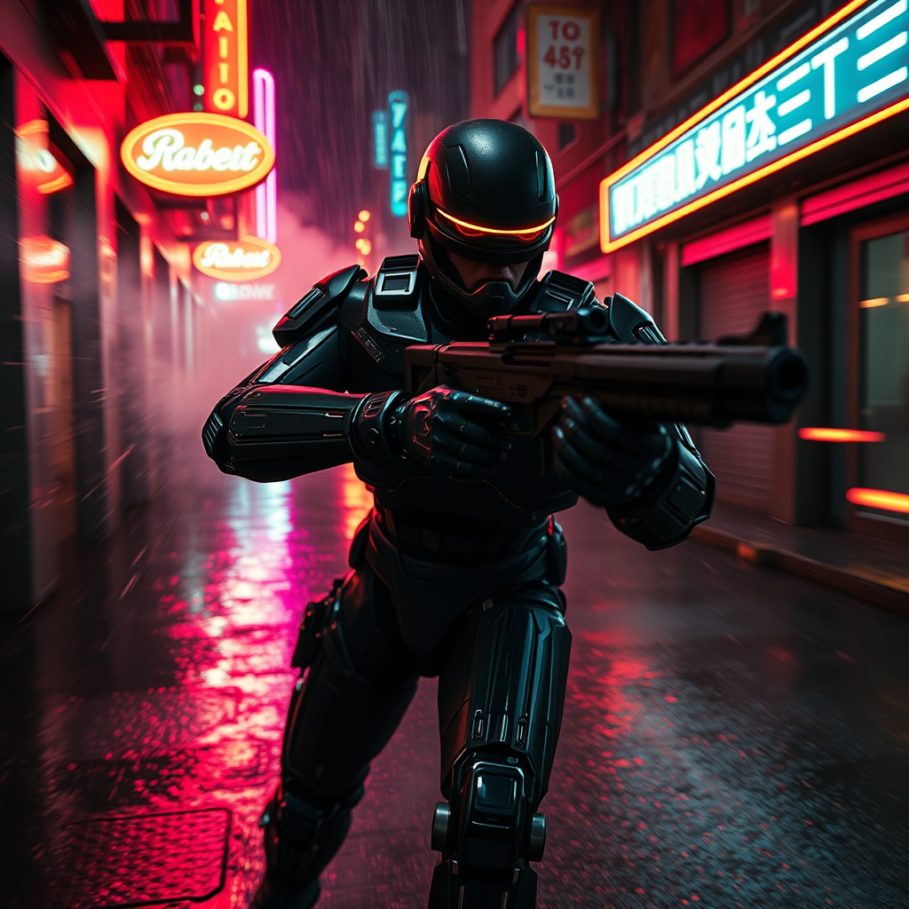 Cinematic ultra-wide still shot of a cyborg law enforcement agent reminiscent of RoboCop engaged in a dramatic gunfight, featuring cybernetic limbs and a sleek helmet with a glowing visor. He moves dynamically through the scene with bullets cascading around him, captured with a sense of intense motion and blur. The setting is a rain-soaked, dimly lit alley illuminated by vibrant neon lights, smoke swirling in the air. The scene is bathed in cinematic lighting with a focus on hyper-realism and intricate details. Evoking themes of trans-humanism, cyberpunk, and a hyper-futuristic world, the style pays homage to the 1980s as if shot by Paul Verhoeven, presenting a high-resolution, expertly framed encounter without visual imperfections like mockup, bad anatomy, text, signature, watermark, user identification, or jpeg artifacts—capturing a dark, desolate atmosphere with a storytelling depth in the extreme wide shot.