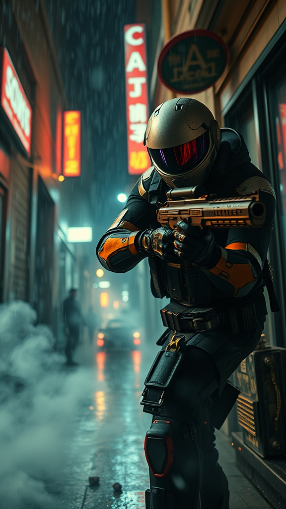 Cinematic ultra-wide still shot of a cyborg police agent engaged in a gunfight, featuring cybernetic limbs and a high-tech helmet with a reflective visor. The agent is captured in a dynamic, kinetic pose as bullets fly around him, amidst a backdrop of a rainy night in a desolate, dark alleyway bathed in neon lights. Smoke swirls through the scene with cinematic lighting enhancing the atmosphere. This extreme wide shot emphasizes hyper-realism and hyper-detail, embracing themes of trans-humanism and cyberpunk. The setting is hyper-futuristic, inspired by 1980s aesthetics and shot in a style reminiscent of Paul Verhoeven. The overall composition avoids negative attributes such as mockup appearance, bad anatomy, and poor quality elements like text, signatures, and low resolution, ensuring a sharp, well-framed, and high-definition image.