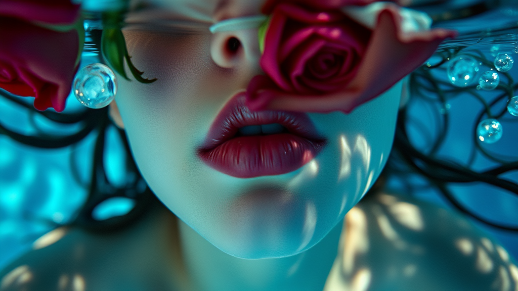 Cinematic underwater-photo capturing a girl with roses floating above, close up of her lips, showcasing editorial quality with light fracturing and reflections on water, utilizing depth of field in rich blue hues, incorporating a blue-core aesthetic, shot on Kodak Portra 800 film, using a 105 mm f1.8 lens, aspect ratio 2:1, quality 2, version 5.