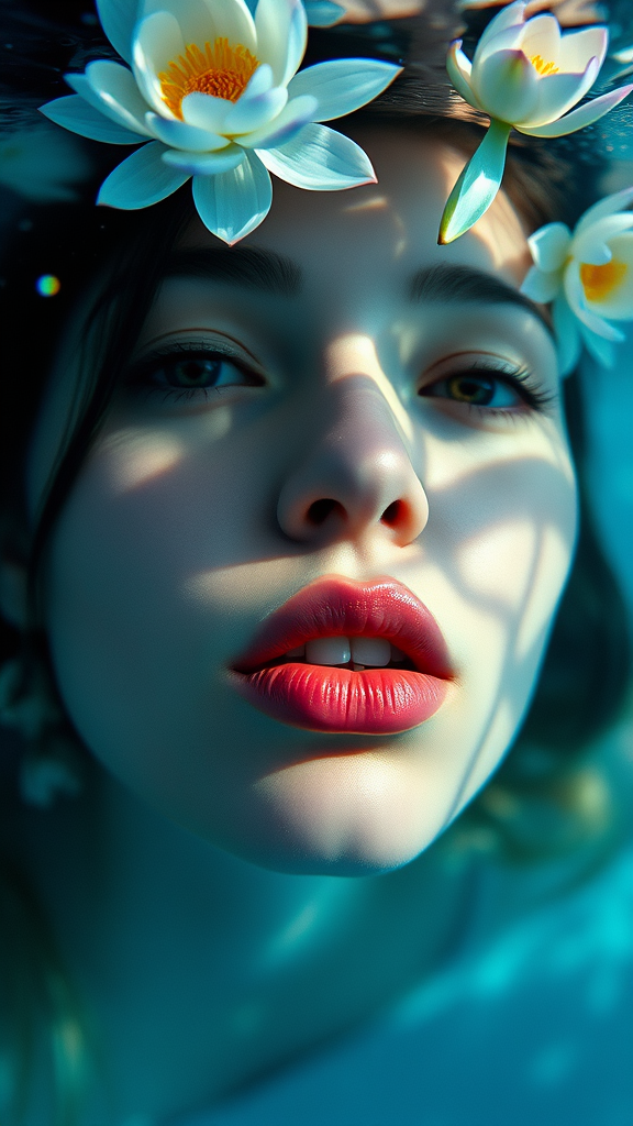 Cinematic underwater photo capturing a young woman, her lips in close-up as delicate water lilies float above, embodying an editorial allure. The scene celebrates water light fracturing and playful reflections with a captivating depth of field. Shades of blue dominate, enhanced by the vintage charm of Kodak Portra 800 film, shot with a 105mm f1.8 lens under an aspect ratio of 2:1, offering an ethereal yet contemporary aesthetic. Subtle creative touches include soft iridescent hues glinting through the water, adding a touch of mystique to the composition.