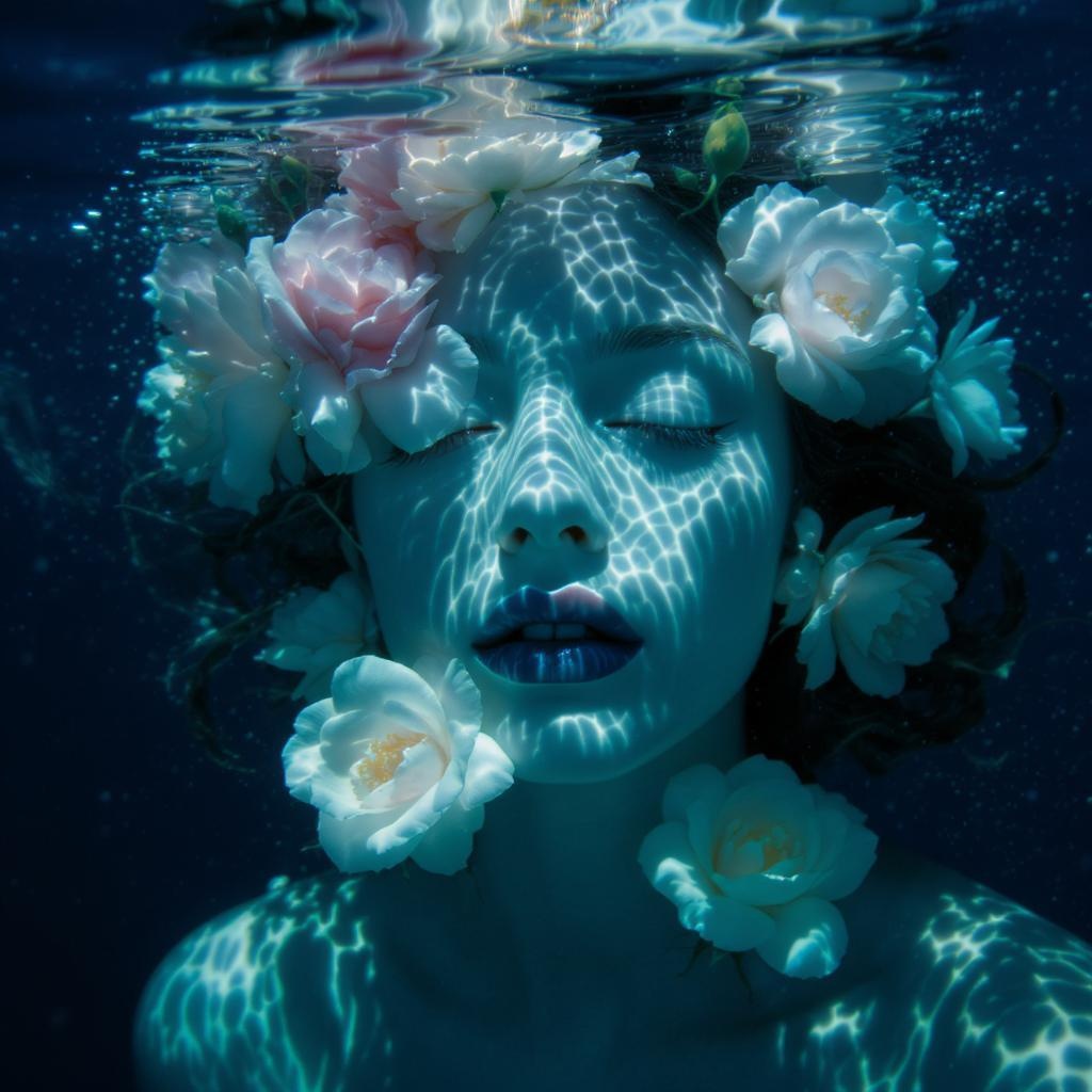 cinematic underwater photo focusing on a girl's ethereal face framed by water-roses, close-up of her lips with editorial flair, intricate play of light fracturing and reflections on the water surface, creating a serene depth of field, enveloped in a palette of rich blues, reminiscent of kodak portra 800 film, captured with a 105mm f1.8 lens, aspect ratio 2:1, evoking a dreamlike underwater world.