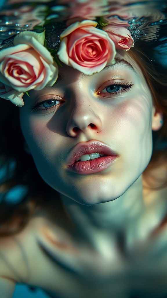 Cinematic underwater photo of a girl with water roses floating above, focusing closely on her lips, capturing editorial quality. Play of light fracturing and water reflections adds depth. Rich blue hues dominate, inspired by Kodak Portra 800 film, shot with a 105mm lens at f/1.8. The image features soft depth of field, creating a serene and mesmerizing underwater atmosphere.