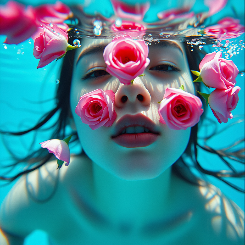 Cinematic underwater photograph capturing a girl with water-roses floating above the surface, focusing closely on her lips. The image boasts editorial quality, featuring the light fracturing and reflections of water, enhanced by a sense of depth of field. The scene is awash with shades of blue, creating a calming blue-core effect. Shot with Kodak Portra 800 film at 105mm f1.8, the composition maintains a cinematic aspect ratio of 2:1, ensuring high quality and vivid expression. Subtle creative tweaks enhance the visual narrative, inviting an intriguing underwater serenity.