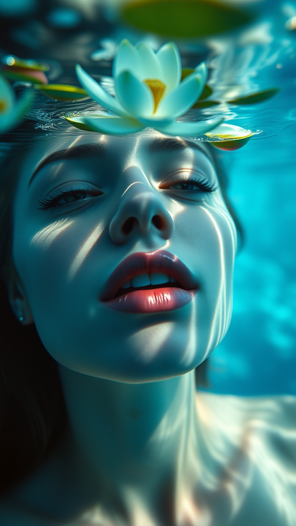 Cinematic underwater photograph of a woman, water-lilies floating above, close up on her lips, editorial quality, light fracturing and shimmering water reflections, depth of field with predominant blue hues, essence of blue-core, captured on Kodak Portra 800, shot with a 105 mm f1.8 lens, aspect ratio 2:1, quality level 2, version 5.