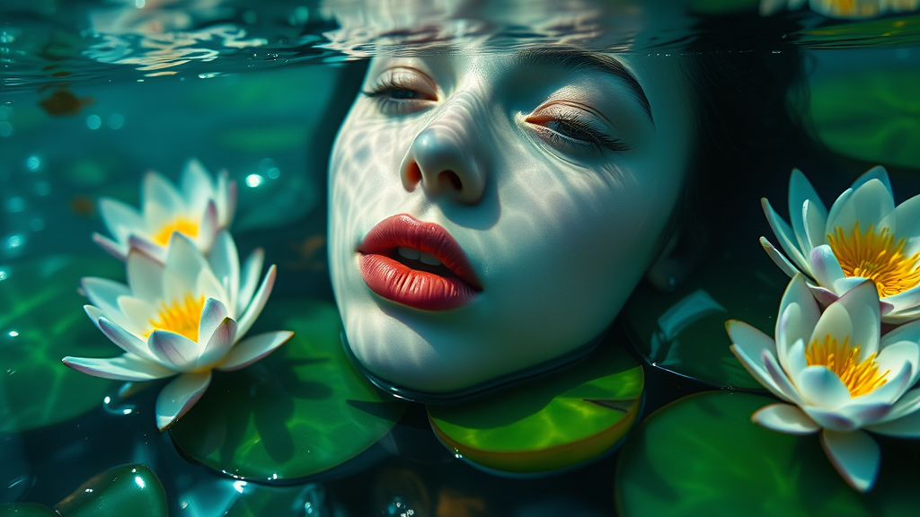 cinematic underwater photography of a girl surrounded by water lilies just above the surface, close-up of her lips, capturing editorial quality with intricate light fracturing and reflections on the water, featuring a deep blue color theme, enhanced with the nostalgic tones of kodak portra 800, shot with a 105mm f1.8 lens to achieve a shallow depth of field, creating a serene and dreamlike atmosphere