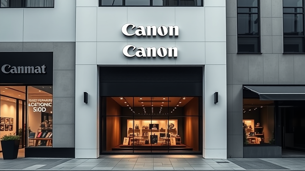 Cinematic urban storefront, designed with a Canon EOS 5D in mind; minimalistic retail facade featuring geometric lines and shapes, dressed in a monochromatic color palette, and emphasizing sleek simplicity and modern aesthetics.