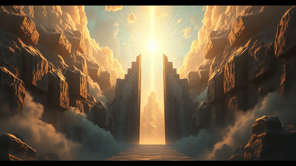 "Cinematic view of the celestial gates to heaven, intricately detailed and rendered in stunning 8K, showcasing a blend of realism and fantasy. Inspired by the artistic styles of Ivan Aivazovsky, Peter Mohrbacher, and Greg Rutkowski, it features atmospheric effects with volumetric light and broad illumination. The scene is reminiscent of an oil painting infused with elements of sci-fi realism, crafted for premium prints. Enhanced by the capabilities of an unreal engine, this vision captures the ethereal, otherworldly beauty of the divine entrance, enveloped in a mystical aura."