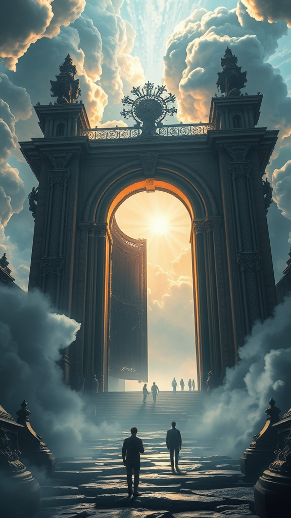 Cinematic view of the heavenly gates, intricately detailed, captured in stunning 8k realism, evoking a sense of awe and wonder. Crafted in a style reminiscent of Ivan Aivazovsky, Peter Mohrbacher, and Greg Rutkowski, the scene is infused with atmospheric charm and volumetric light effects. Bathed in broad, ethereal light, the setting resembles a masterful oil painting, blending elements of fantasy, sci-fi, and realism. Designed for premium prints, the visual is so vivid and immersive, it appears to be rendered within the Unreal Engine, inviting viewers into a celestial realm beyond imagination.