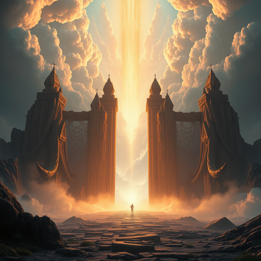 Cinematic vista of heavenly gates, meticulously detailed, captured in stunning 8k, exuding realism and atmospheric depth, reminiscent of the styles of Ivan Aivazovsky, Peter Mohrbacher, and Greg Rutkowski. Featuring soft volumetric light and expansive illumination, this oil-painting-inspired fantasy art blends elements of sci-fi and realism, creating an image worthy of premium prints. Rendered with unreal engine-like precision, the scene presents an imaginative interpretation of paradise imbued with a dreamlike quality.