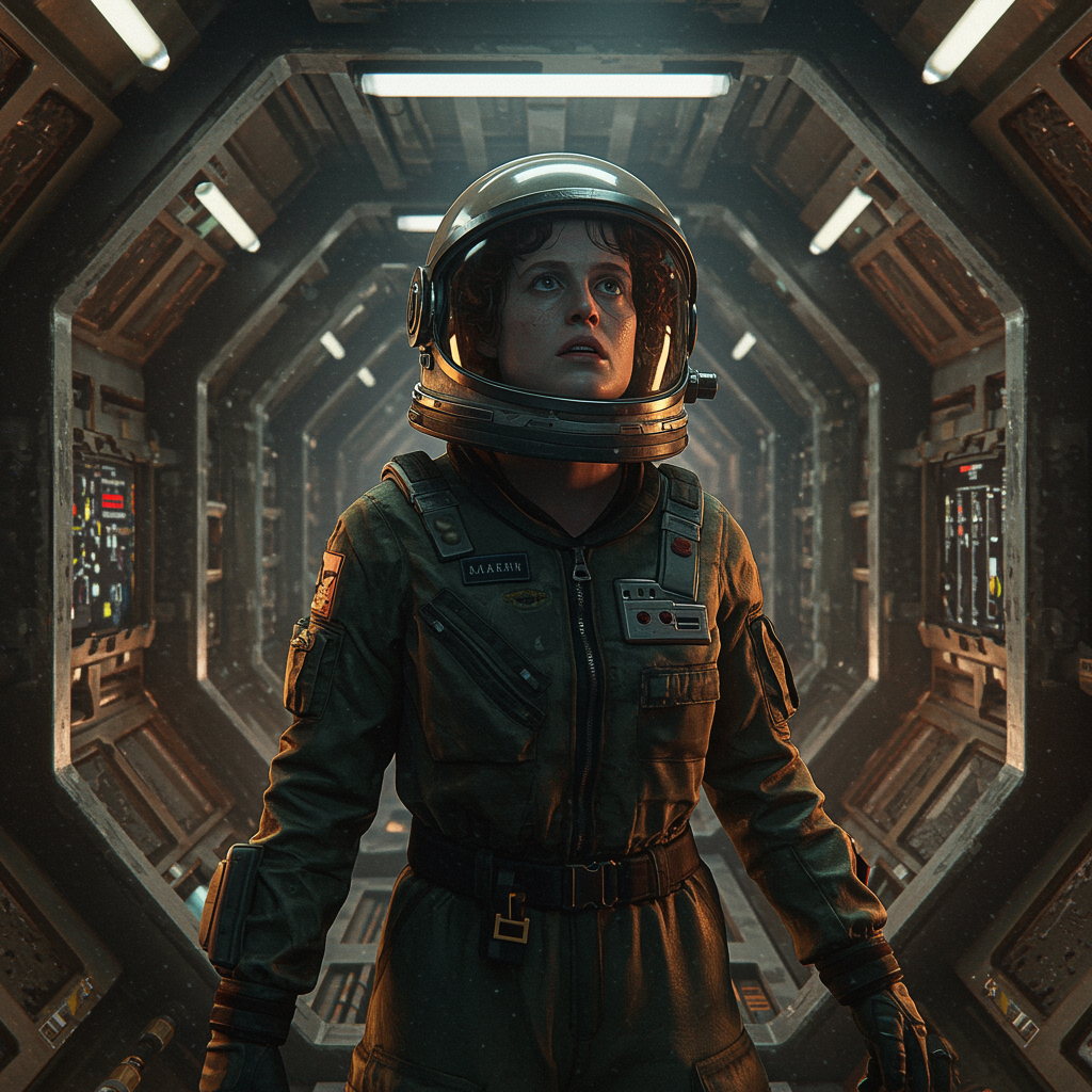 View this AI-generated image featuring cinematic 8k wallpaper featuring an astronaut inspired by ellen ripley from the alien movie wearing a helmet with the visor closed gazing upward in a dynamic pose the figure stands amidst the intricate interiors of a spaceship reminiscent of the nostromo exudin