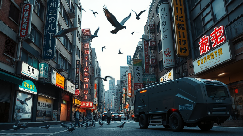 Cinematic wide, static shot of a bustling neo-Tokyo city street. The building facades are slightly worn, with hints of age and history, yet they boast futuristic elements like vibrant neon signs and subtle holographic advertisements that flicker gently in the evening light. Pigeons dart across the frame, adding a sense of life and movement, as an automated garbage truck hums by silently, its sleek design a stark contrast to the textured urban landscape. The atmosphere is a fusion of timeless nostalgia and cutting-edge technology.