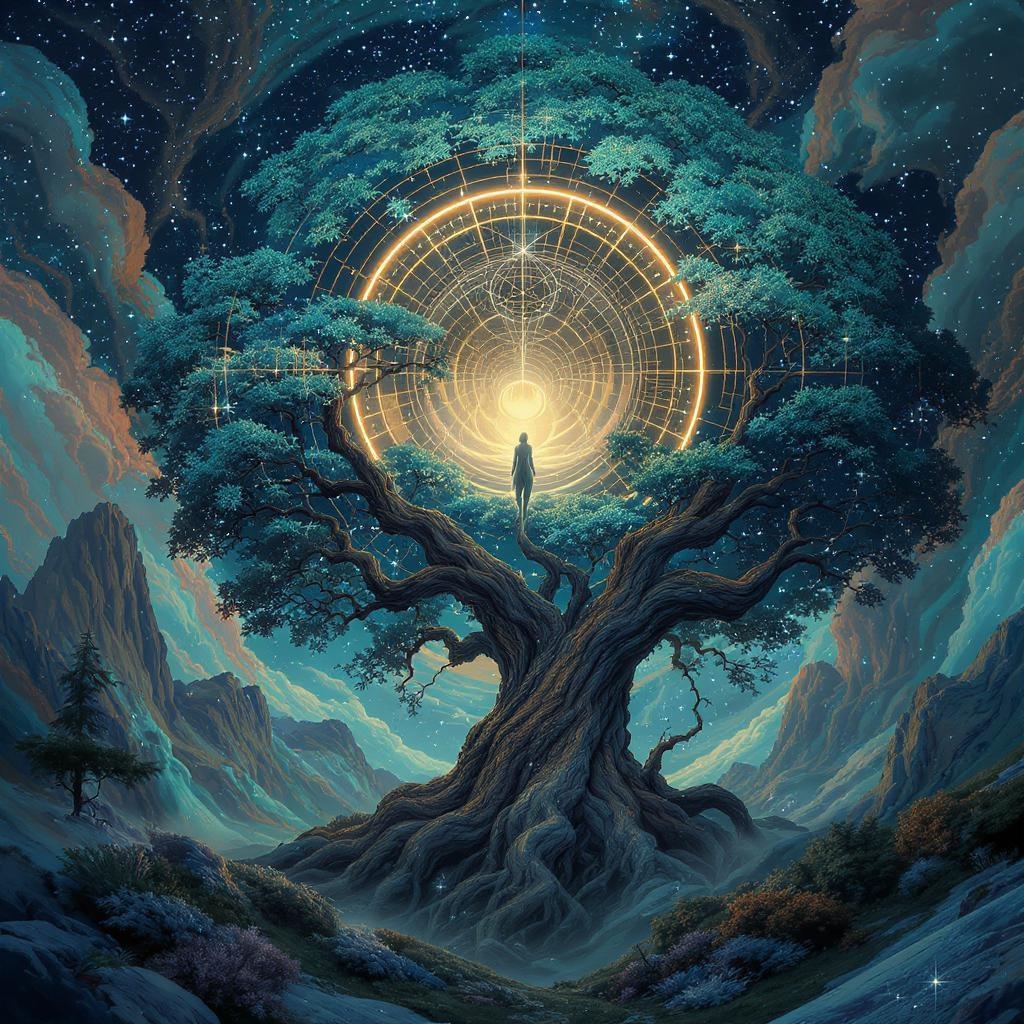 View this AI-generated image featuring a majestic circle encompassing a serene figure floats above a sprawling ancient tree set against a backdrop of vibrant fantasy landscapes the scene is awash with hues of teal and bronze embodying an energy filled mystical illustration style capturing the essenc