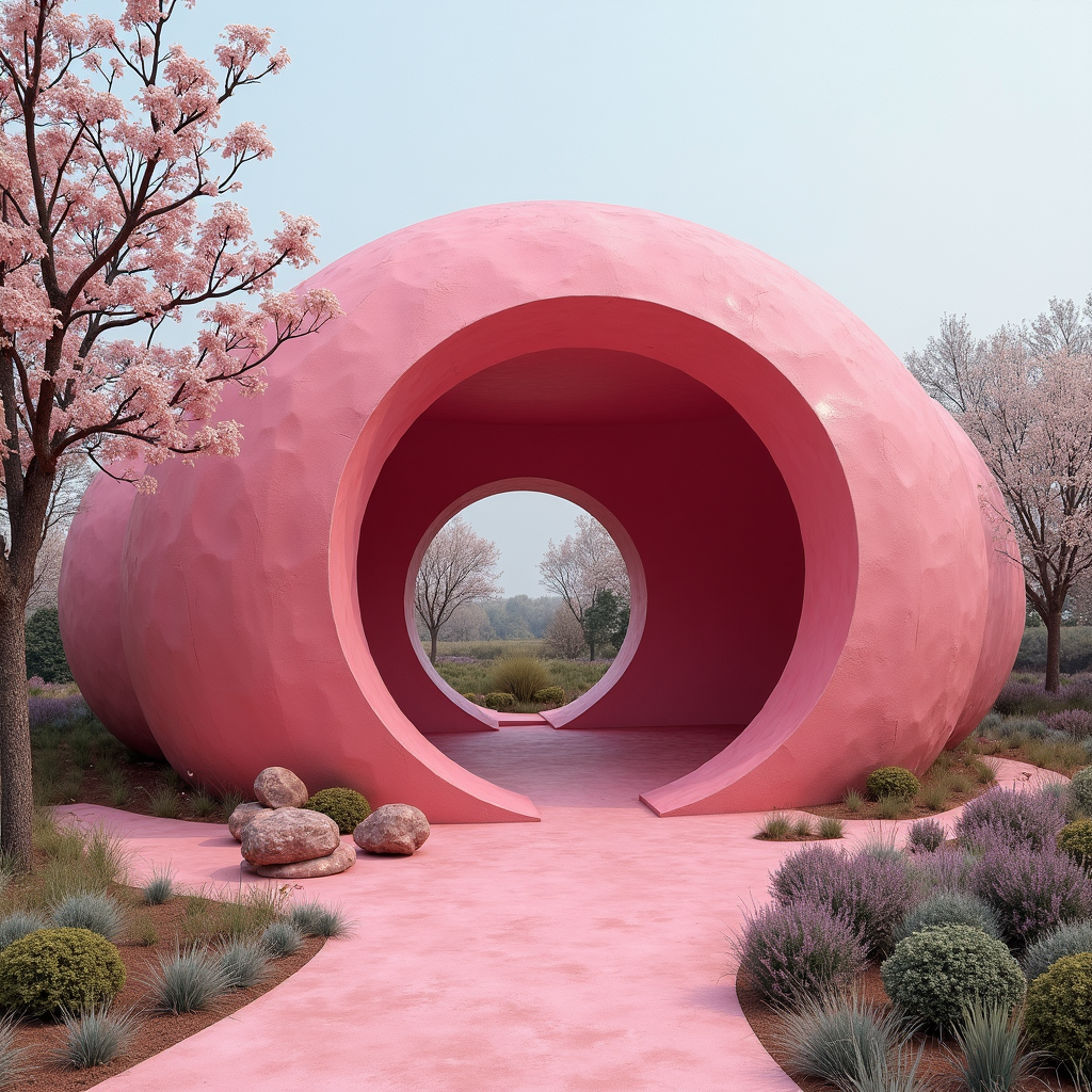A vibrant circular pavilion featuring a central round window, surrounded by flowing pink arches, stands as a mesmerizing fusion of psychedelic and biomorphic architecture. This surreal garden temple, reminiscent of Verner Panton's playful designs, showcases a harmonious blend of vegetal and organic forms. The pink zen-like structure is an outdoor art installation of high architectural artistry, with curving geometric arches crafted from pink concrete, exuding a captivating aesthetic. Designed in the spirit of Lee Loughridge, it beautifully integrates organic shapes with innovative design, inviting visitors into its dreamlike realm.