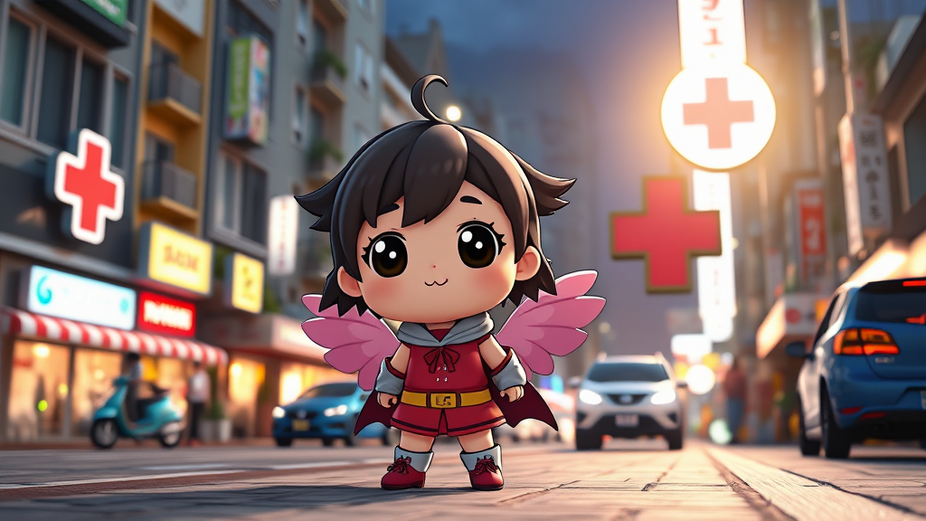city street, Izu Midorikya, 3D rendered, bright street light, full body figure, kawaii, chibi, small, loli, cute face, big eyes, blind box pop mart, PXTR style, detailed 3D model, adorable, sweet smile, happy, teenage outfit, red cross symbol, city building silhouette, illuminous background, glowing, bright colors, high details, 8K resolution, cozy atmosphere, soft focus, magic, intricate details, miniature, digital painting, ecd master, trophy, pastel colors, wild combos, superhero suit, girl child, infernal cow, cute and friendly, lucky moment, urban view, blue car, giant wings, oversized book, electric guitar, fairy wings, birds wings, stack of cookies, dreamy, boring, cute mouth sculpture, miniature clothes, magic line, doll size, secgain sd seven, unknown unknown, widened eye, stdygfil stock, acid core artisan fashionable shooting states span heard Ashton Melania goto street spontdns Somali Kristen SEO exposition autop tv featured girl employee small Mexican scene end.