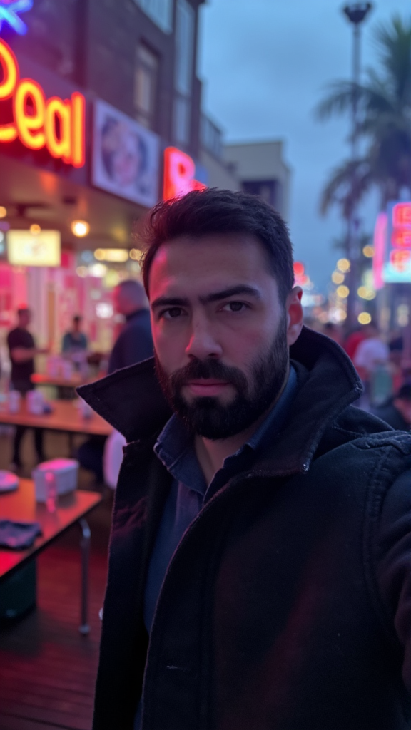 city street, neon, fog, volumetric, closeup portrait photo of young man in dark clothes