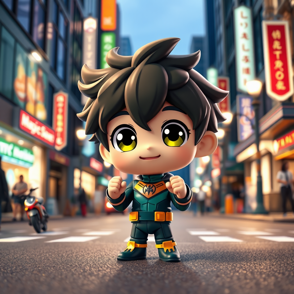 City street scene featuring an adorable 3D full-body image of Izuku Midoriya. He has big, bright eyes exuding happiness, rendered in a chibi style with an emphasis on cuteness and high detail. The scene showcases a city under bright street lights, with translucent, luminous qualities adding a magical touch. Designed in a pop art style reminiscent of toy figures, with influences from Pixar and complex textures. The background is solid and vibrant, set against a whimsical Magic Space Warehouse. Studio lighting highlights the petite, kawaii form of the character, inspired by SD (Super Deformed) aesthetics. Izuku is posed with closed fists, adding a dynamic touch to his stance. The overall render is in 8K resolution, capturing intricate details and a charming facial expression. The composition avoids unnecessary elements like cropped areas, text overlays, or visual artifacts, maintaining focus on Izuku's enchanting and colorful depiction.