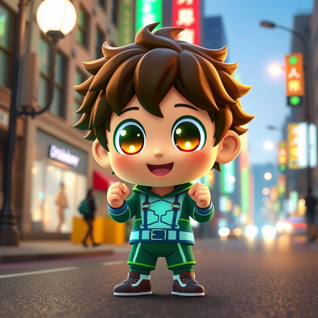 City street scene featuring an adorable 3D full-body image of Izuku Midoriya, exuding cuteness and happiness with large, expressive eyes. Rendered in C4D with pop matt blind box style, the setting includes bright street lights against a solid color background. The character is in a chibi style with fluorescent translucency, creating a luminous and kawaii doll-like appearance. The design draws inspiration from Pixar with complex details at 8K resolution, featuring studio lighting setup. Despite petite proportions reminiscent of toddlers, there is focus on high detail. The environment has a "Magic Space Warehouse" feel, emphasizing whimsical elements. Midoriya stands with closed fists, depicted without text or logos. Eyes convey emotion without crossing, while the face is unique, maintaining visual integrity without mutations. The character is centered, avoiding cropping, maintaining high resolution, free of artifacts or any identifiers like signatures or watermarks. This imaginative rendition maintains the original charm with artistic flair.