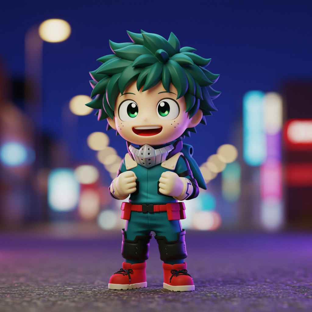 City street scene featuring an adorable 3D full-body model of Izuku Midoriya, showcasing his big, expressive eyes that exude happiness. Designed in a chibi style, this character captures a sense of kawaii charm with a luminous and fluorescent translucent body. The environment is set against a solid color background with bright street lights, reminiscent of a vibrant toy-like aesthetic. Inspired by the detailed art style seen in Pixar films and Pop Mart blind box figures, this piece is rendered using advanced tools like C4D and OC renderer, ensuring high detail in 8K quality. The scene draws from the Magic Space Warehouse for an imaginative backdrop while incorporating character elements typical of SD (super-deformed) figures. Izuku's pose features closed hands in a fist, contributing to a playful yet determined expression. Despite minor reimaginings, the essence of joy and cuteness remains central to the composition.