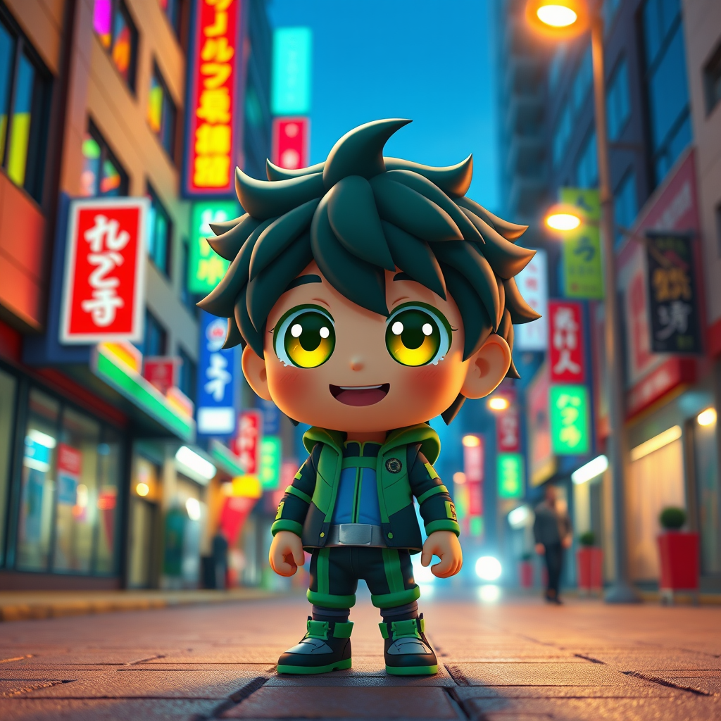 City street scene featuring an adorable Izuku Midoriya in full-body 3D, with large, bright eyes and a joyful expression. Created using C4D with inspiration from pop matt blind boxes, the character stands under vibrant street lights, embodying chibi style with fluorescent translucency and a glowing aura. Designed as a kawaii doll, the render captures complex details akin to Pixar's style. The scene is set against a simple, solid color background with influences from a Magic Space Warehouse, illuminated by studio lighting, emphasizing high detail in an 8K resolution. Rendered in OC with inspiration from Dribble's aesthetics, the character maintains petite proportions with small closed fists, reflecting a loli, SD character format. Despite being slightly stylized, Izuku’s features avoid distortions like deformed irises or pupil issues.