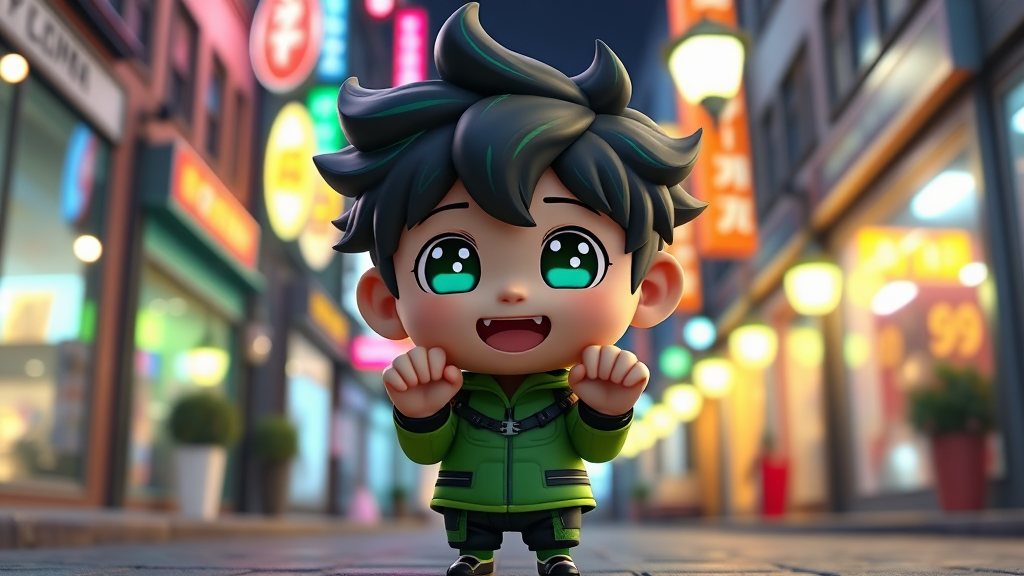 City street, super adorable Izuku Midoriya full body 3D image, with a joyful expression and big bright eyes, capturing a cute and happy vibe in high detail. Rendered in C4D with a touch of Pixar's vibrant storytelling style, this chibi figure features fluorescent translucency, glowing elements, and kawaii aesthetics. Inspired by pop mart blind box toys, the scene is set with a luminous street light and a solid bright background, hinting at a whimsical magic space warehouse. The character design boasts detailed 3D rendering resembling a petite, toddler-like chibi with closed hands forming small fists. The image is high-resolution 8K with studio lighting, offering complex details and an irresistible cuteness reminiscent of SD characters. The playful character is surrounded by a backdrop that suggests a magical, dreamy world, inviting viewers into a realm of bright and cheerful imagination.