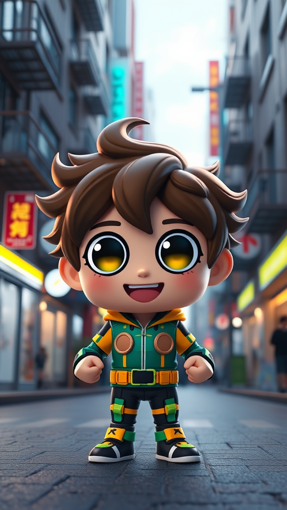 City street, super adorable Izuku Midoriya full body 3D image, 1pc, expressive large eyes, joyful expression, C4D design, pop mart blind box style, bright street lighting, toy-like appearance, solid color backdrop, chibi style, with a hint of fluorescent translucency, glowing features, kawaii charm, doll-like appearance, Pixar influence, intricate detailing, 3D rendering with OC renderer, FOL body reference, vibrant colors, studio lighting enhancing features, capturing a petite and chibi essence, SD characters: 23, magical space warehouse setting, hands closed in fists, playful logo elements, whimsical text, seamless blend of deformed iris and pupils, distinct visual appeal, without cloned or duplicated features, precise render avoiding common visual flaws like extra fingers or mutated hands, avoiding cropping, low resolution issues, and maintaining clarity without unnecessary text or artifacts, no signature or watermark elements, full view within the frame, maintaining a standard neck proportion.