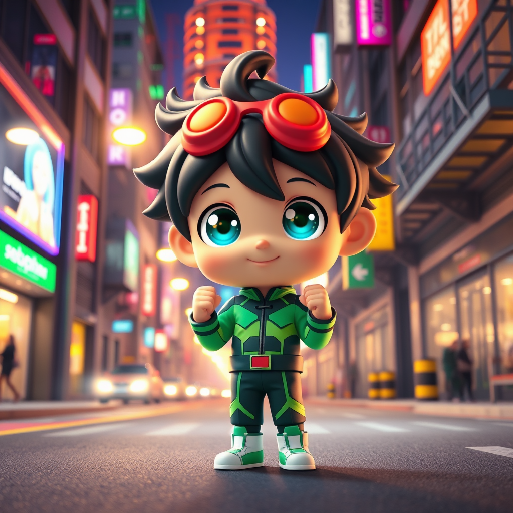City street, super adorable Izuku Midoriya in full-body 3D render, with expressive, large bright eyes, exuding cuteness and happiness, crafted using C4D software. Inspired by pop culture aesthetics and blind box toy designs, set against a vivid cityscape lit by bright streetlights. The scene is filled with charming chibi elements, featuring fluorescent and luminous qualities. The design follows the style of Pixar, with intricate details and high-resolution 8K quality, utilizing studio lighting to highlight the character’s kawaii doll-like features. This rendering combines aspects from FOL reference sheets and Dribble influences, while keeping focus on petite toddler-like proportions. The character stands in a magic space warehouse backdrop, with his hands closed into fists, conveying determination. The artwork maintains high details in the face and body, ensuring clarity without any unwanted visual effects like deformed features or additional limbs. Avoids unnecessary artifacts like logos, text, or watermarks, achieving a clean, polished finish. The image opts for a creative yet cohesive narrative, maintaining the essence of the prompt while integrating subtle imaginative twists.