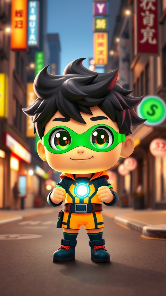City street, super cute Izuku Midoriya full body 3D image, well-defined big eyes, cheerful expression, created in C4D, pop matt blind box aesthetic, illuminated by bright street lights, toy-like charm, solid color backdrop, chibi style with fluorescent translucency, luminous body, kawaii doll-like appearance, Pixar-inspired with complex details, crafted with 3D rendering techniques using OC renderer, high details in 8K resolution, studio lighting effect, petite chibi design, SD characters: 23, whimsical Magic Space Warehouse setting, closed fists, branded elements subtly integrated, unique iris and pupil design, avoiding any visual inconsistencies, ensuring image quality is free of artifacts and extraneous marks, maintaining focus on a singular detailed view without frame interruption.
