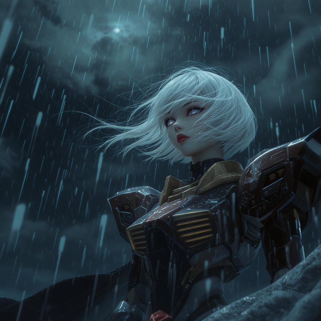 A girl clad in intricate Gundam-style armor stands alone under the dark, rain-soaked sky, her short white hair billowing in the turbulent wind. The scene is trending on art platforms, showcasing extreme detail and a cinematic feel. It evokes a masterpiece of photography with a stunning environment—shiny, smooth, surreal, and almost divine. The setting is celestial and otherworldly, reminiscent of manga and anime CGI. The visual experience is maximized through 3D rendering techniques, capturing the essence of a lifelike doll with octane precision. The scene is marked by ethereal beauty, with a focus on maintaining the integrity of proportions and lifelike anatomy, avoiding visual distractions or distortions that detract from its otherworldly allure.