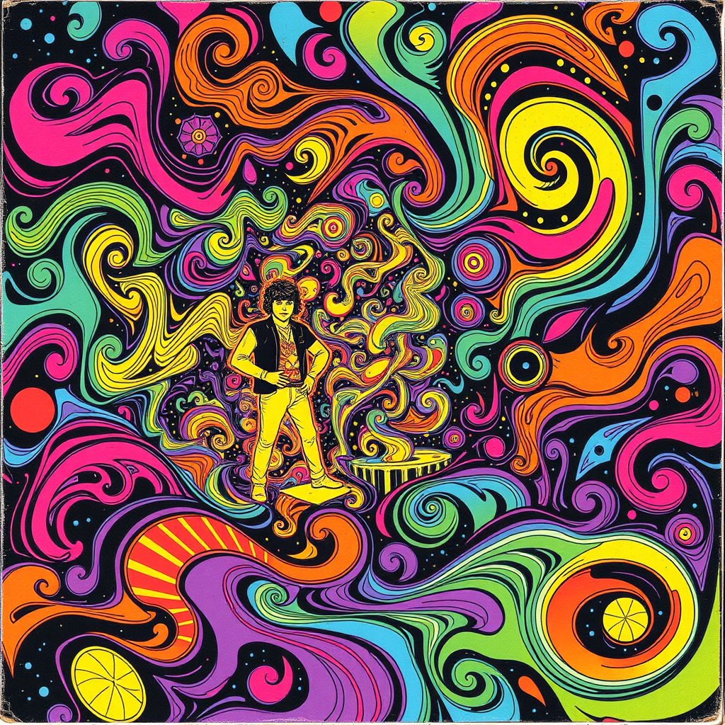 Classic 1970s rock band album cover featuring swirling psychedelic patterns and vibrant, bold colors, evoking a sense of vintage nostalgia with intricate, mesmerizing designs and abstract shapes that capture the essence of the era's music scene.