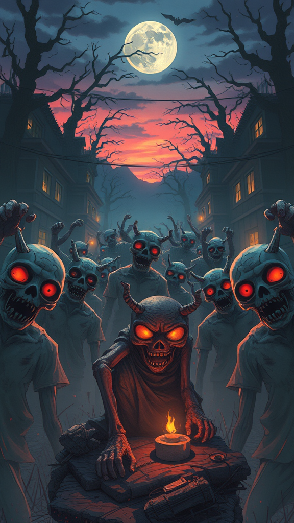 Classic anime horror scene capturing a surreal moment from a vintage studio ghibli-esque film, showcasing a hauntingly beautiful zombie horde crafted with the whimsical yet eerie artistry reminiscent of Hayao Miyazaki's style, featuring intricate details, expressive character designs, and a dreamlike landscape engulfed in an eerie twilight ambiance.
