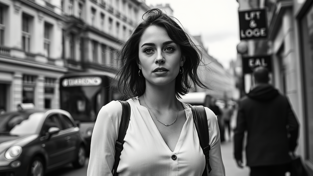 Classic black and white street portrait of a captivating woman navigating the bustling streets of London, captured with an Arriflex 35 BL Camera equipped with Canon K35 Prime Lenses, embracing urban energy with subtle artistic chaos and a touch of personalized flair, featuring a 1:2 aspect ratio and enhanced stylization to highlight her grace amidst the iconic city backdrop.