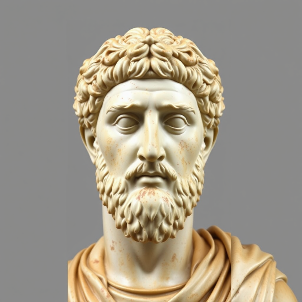 Classical Greek sculpture, detailed portrait of Emperor Hadrian, emphasizing facial features against a minimalistic grey backdrop, elongated vertical frame, artistic flair enhanced with a creative twist, modern visual interpretation.