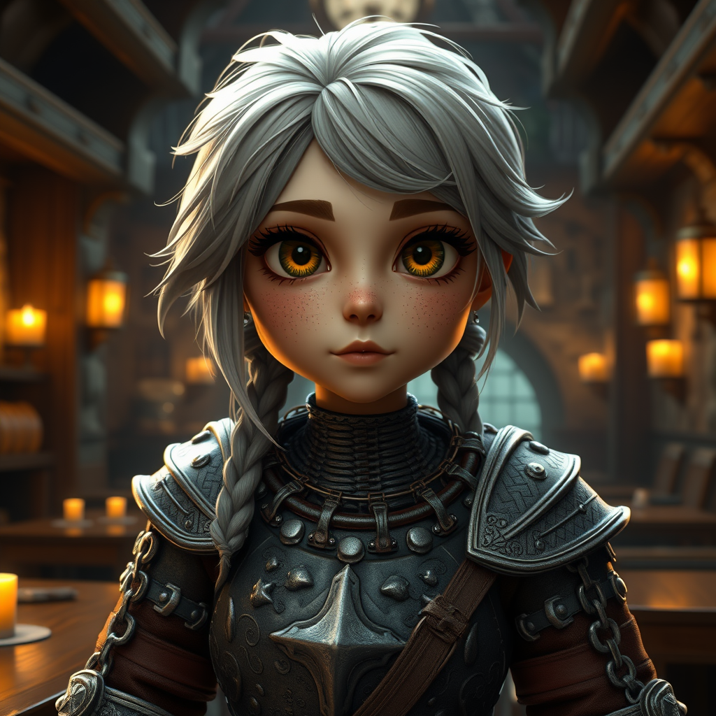 Cleric character in chain mail, a woman with a chibi style, solo in a medieval tavern setting. Inspired by Disney artwork with cozy indoor lighting, fantasy elements, and detailed digital painting. The scene is cinematic, showcasing character design influenced by Mark Ryden, Pixar, and Hayao Miyazaki. This hyperrealistic work utilizes Unreal Engine 5 and Octane Render, exhibiting freckles on the character’s face. The environment suggests a blend of artstation aesthetics with elements of medieval fantasy, featuring intricate details reminiscent of DAZ designs. The character is standing in the tavern, surrounded by the warmth of cozy lighting, exuding a whimsical yet realistic feel.